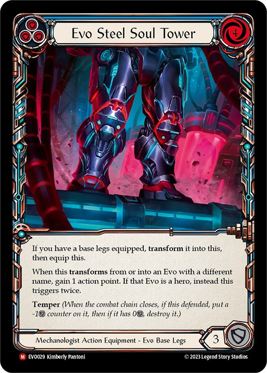If you have a base legs equipped, transform it into this, then equip this. When this transform s from or into an Evo with a different name, gain 1 action point. If that Evo is a hero, instead this triggers twice. Temper (When the combat chain closes, if this defended, put a -1DEFENSE counter on it, then if it has 0DEFENSE, destroy it.)