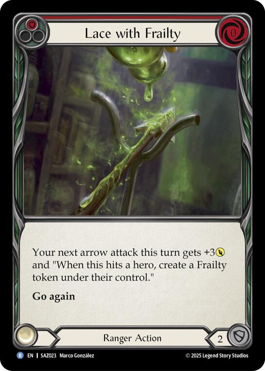 Your next arrow attack this turn gets +3POWER and "When this hits a hero, create a Frailty token under their control." Go again