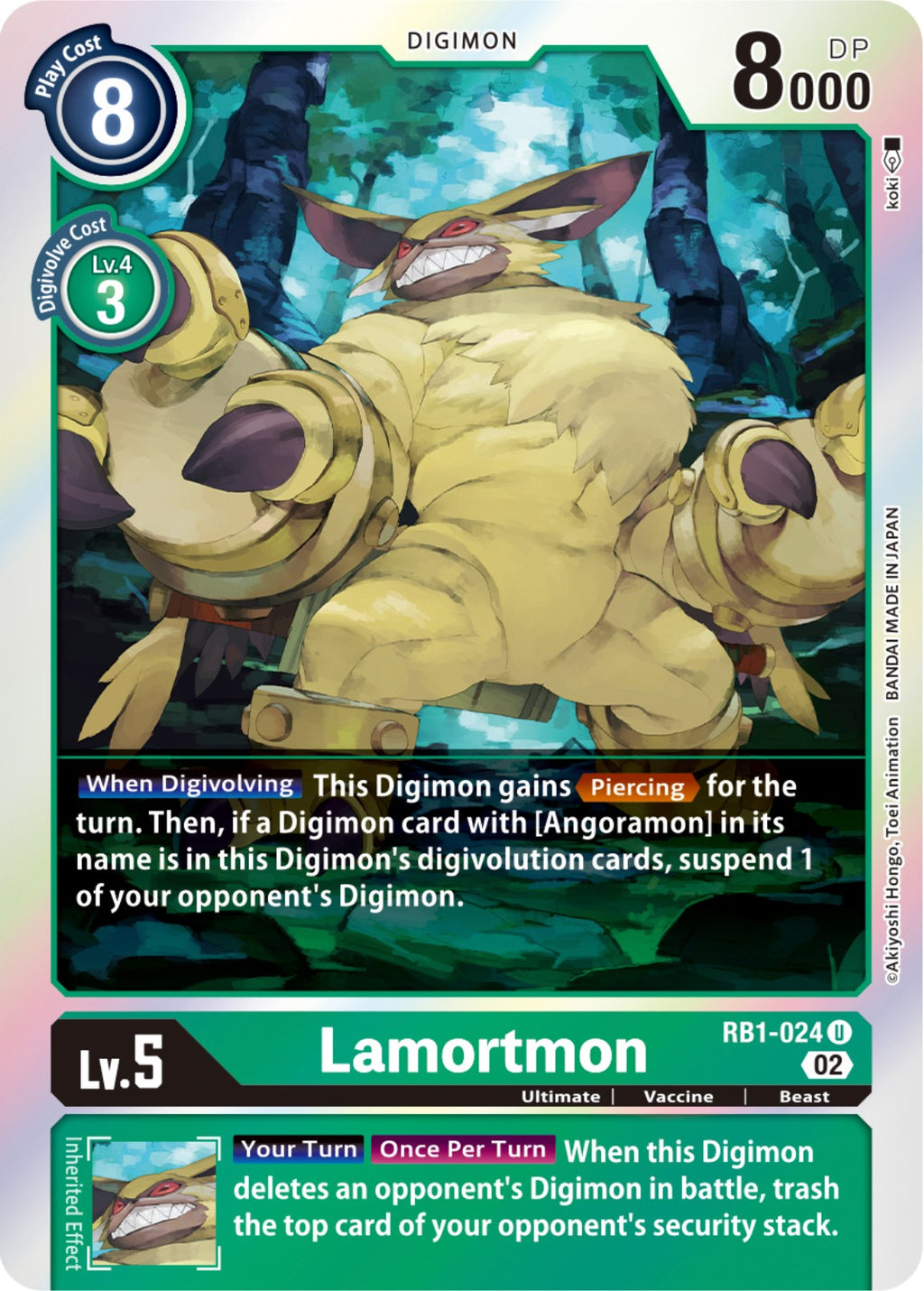 [When Digivolving] This Digimon gains [Piercing] for the turn. Then, if a Digimon card with [Angoramon] in its name is in this Digimon's digivolution cards, suspend 1 of your opponent's Digimon.