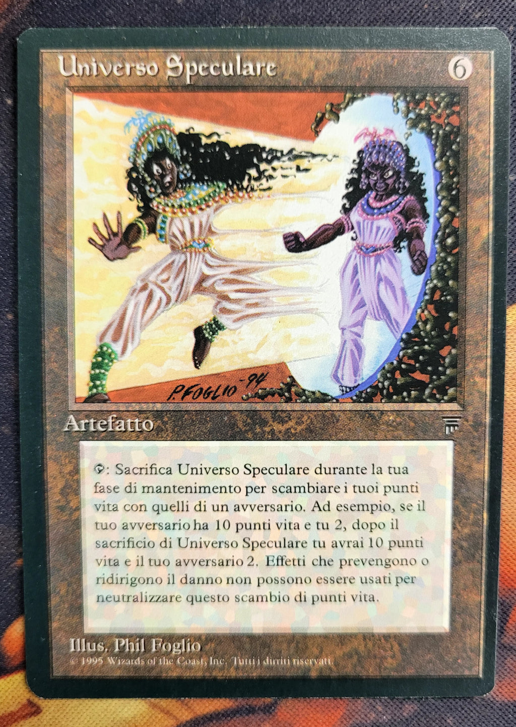 {T}, Sacrifice Mirror Universe: Exchange life totals with target opponent. Activate this ability only during your upkeep.