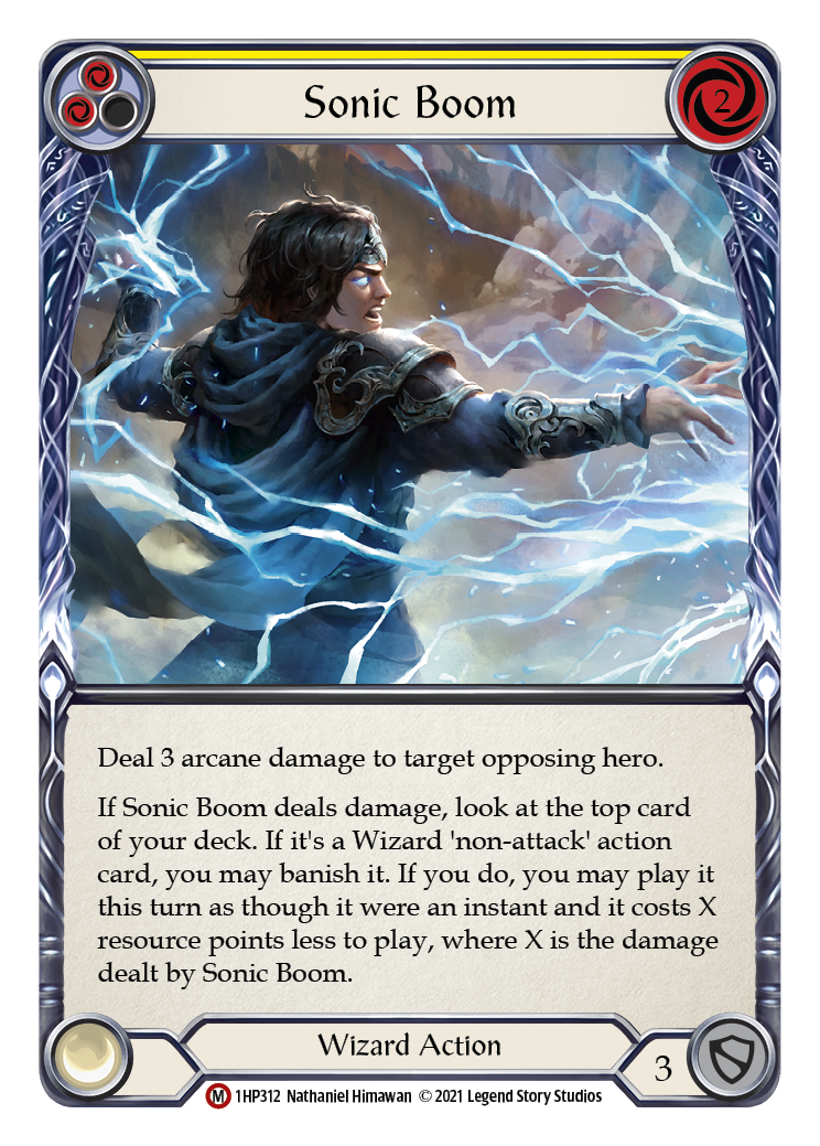 Deal 3 arcane damage to target opposing hero. If Sonic Boom deals damage, look at the top card of your deck. If it's a Wizard 'non-attack' action card, you may banish it. If you do, you may play it this turn as though it were an instant and it costs X resource points less to play, where X is the damage dealt by Sonic Boom.