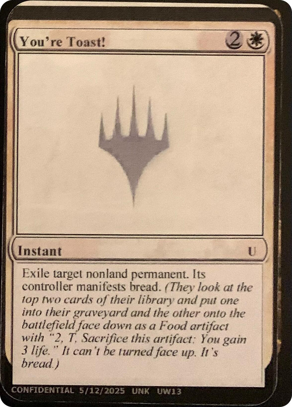 Exile target nonland permanent. Its controller manifests bread. (They look at the top two cards of their library and put one into their graveyard and the other onto the battlefield face down as a Food artifact with "2, T, Sacrifice this artifact: You gain 3 life." It can be turned face up. It's bread.)